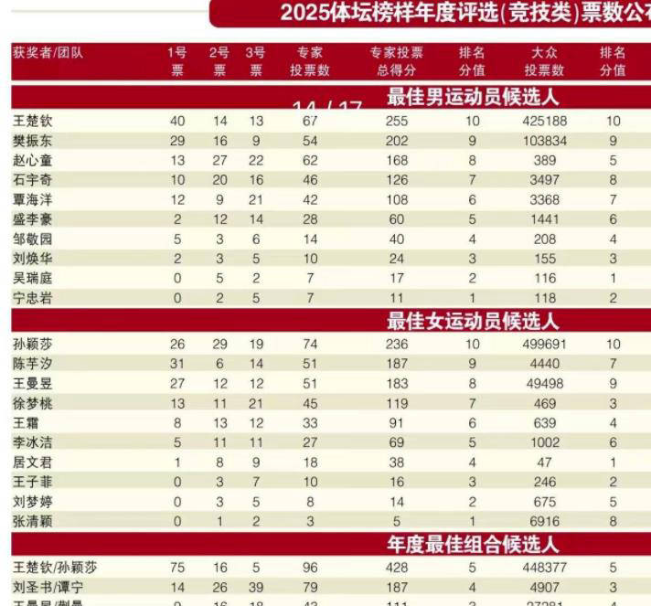 而在最佳女运动员角逐中,竞争尤为激烈。专家一号票最高的是陈芋汐,她本赛季同样表现不凡,拿下世锦赛、世界杯和全运会多项金牌,共计31票紧随其后的是王曼昱和孙颖莎,分别获得27票和26票。然而,大众投票方面,孙颖莎拥有近50万张选票的绝对优势,两者合计分数超越其他参选者:孙颖莎20分、王曼昱17分、陈芋汐16分,可见冠军花落谁家呼声极高。孙颖莎本赛季斩获包括世界杯和世乒赛在内的11冠佳绩,尽管因伤未能出战WTT香港总决赛,但整体表现依然十分耀眼。